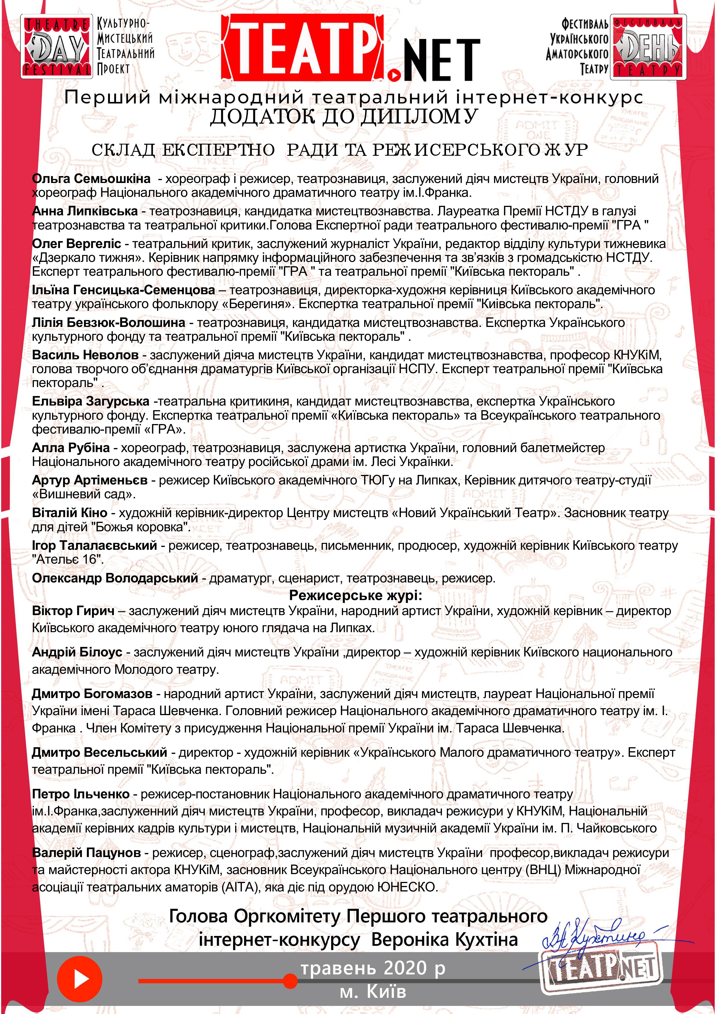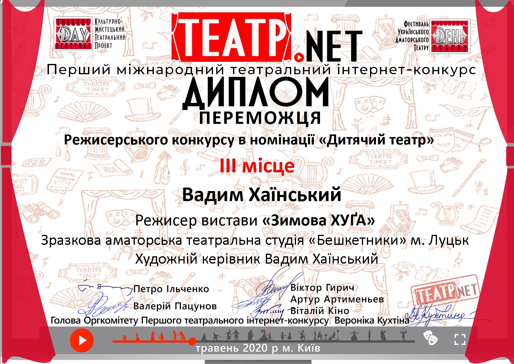 Зразкова аматорська театральна студія "БЕШКЕТНИКИ" Палацу культури міста Луцька, керівник та режисер Вадим Хаїнський, впродовж травня брала участь в першому Міжнародному театральному інтернет-конкурсі «Театр.NET». Поетичну виставу "Зимова ХУҐА" відібрано до участі в конкурсі у номінації «Дитячий театр». Експертна Рада протягом місяця передивлялася відібрані вистави і обирала переможців режисерського конкурсу, а також переможців в кожній номінації. з 5 травня по 14 травня відбувалося онлайн голосування за «приз глядацьких симпатій», вистава «Бешкетників» зібрала 169 голосів, а вцілому український театр підтримали 60 тисяч голосів з 29 країн світу! Також впродовж травня проходили онлайн конференції, творчі зустрічі, круглі столи з членами експертної ради. Учасники конкурсу почули критику, плюси та мінуси своїх вистави, мали можливість професійного спілкування під час ізоляції.