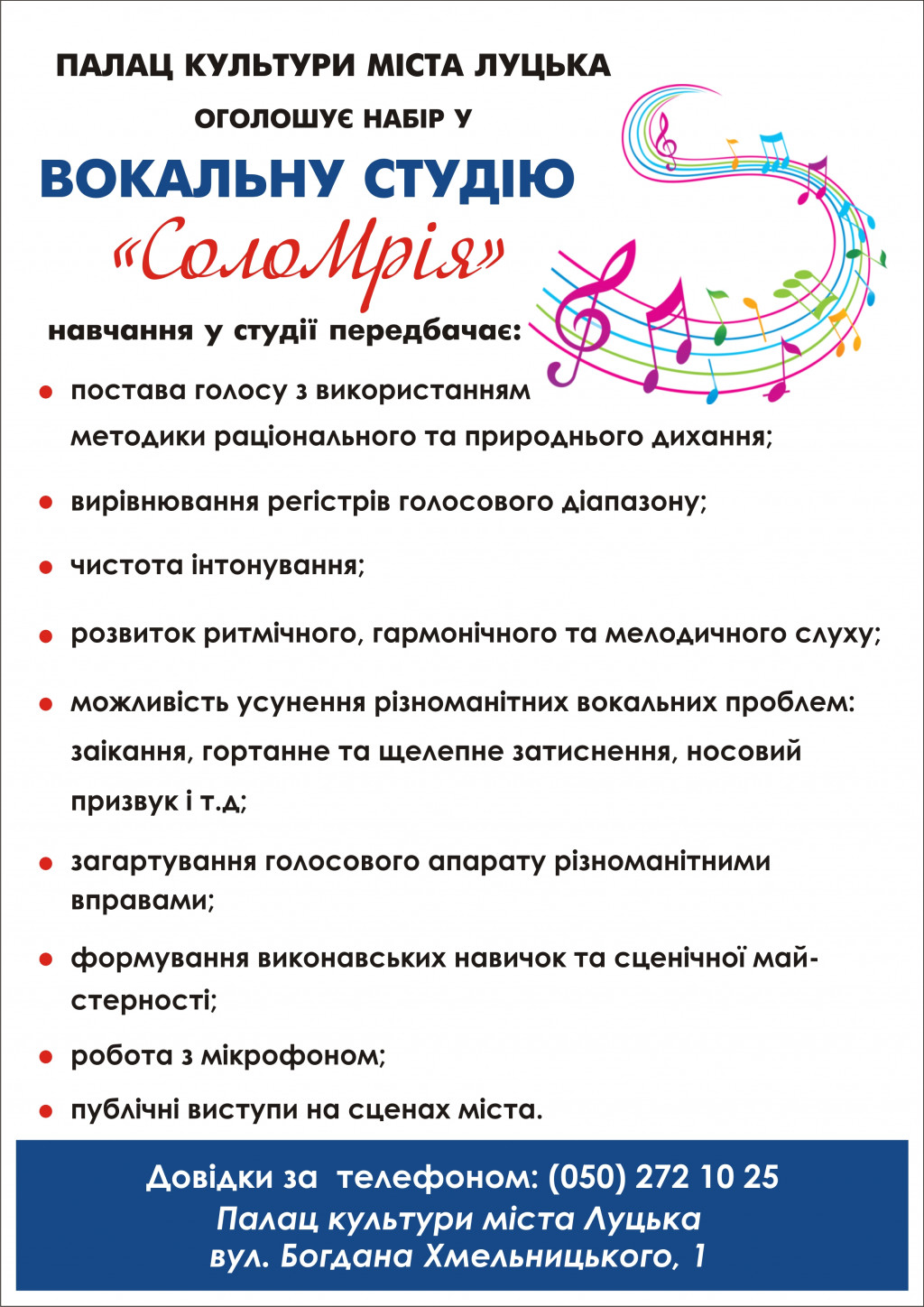 Палац культури міста Луцька оголошує набір у вокальну студію "Соло Мрія".