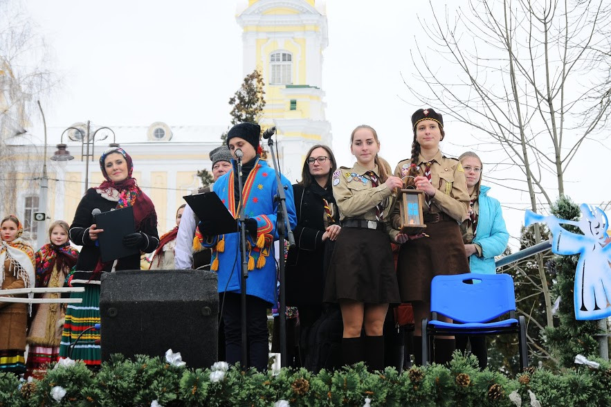 Потому на Театральний майдан члени обласної організації “Пласт” внесли Віфлеємський вогонь та запалили громадську свічу, яку виготовили представники братства бджолярів Волині “Ройовий стан”.
