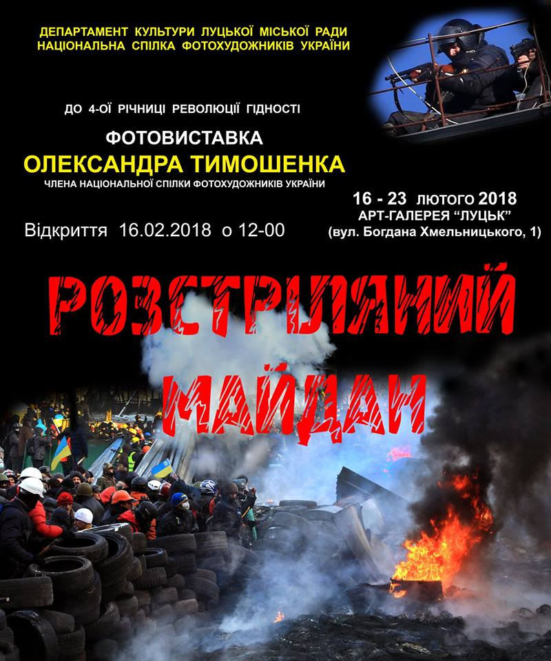 Протягом 16-23 лютого 2018 року в арт-галереї «Луцьк» (вул. Богдана Хмельницького, 1) експонуватиметься персональна виставка робіт київського фотохудожника, члена національної спілки фотохудожників України Олександра Тимошенка «Розстріляний Майдан».