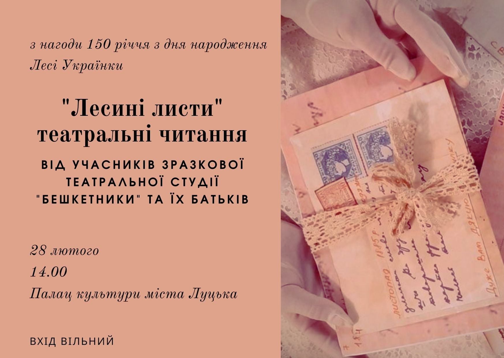 Запрошуємо 28 лютого о 14.00 у Палац культури міста Луцька на театральні читання "Лесиних листів" від учасників зразкової театральної студії "Бешкетники" та їх батьків. Режисер дійства Вадим Хаїнський.