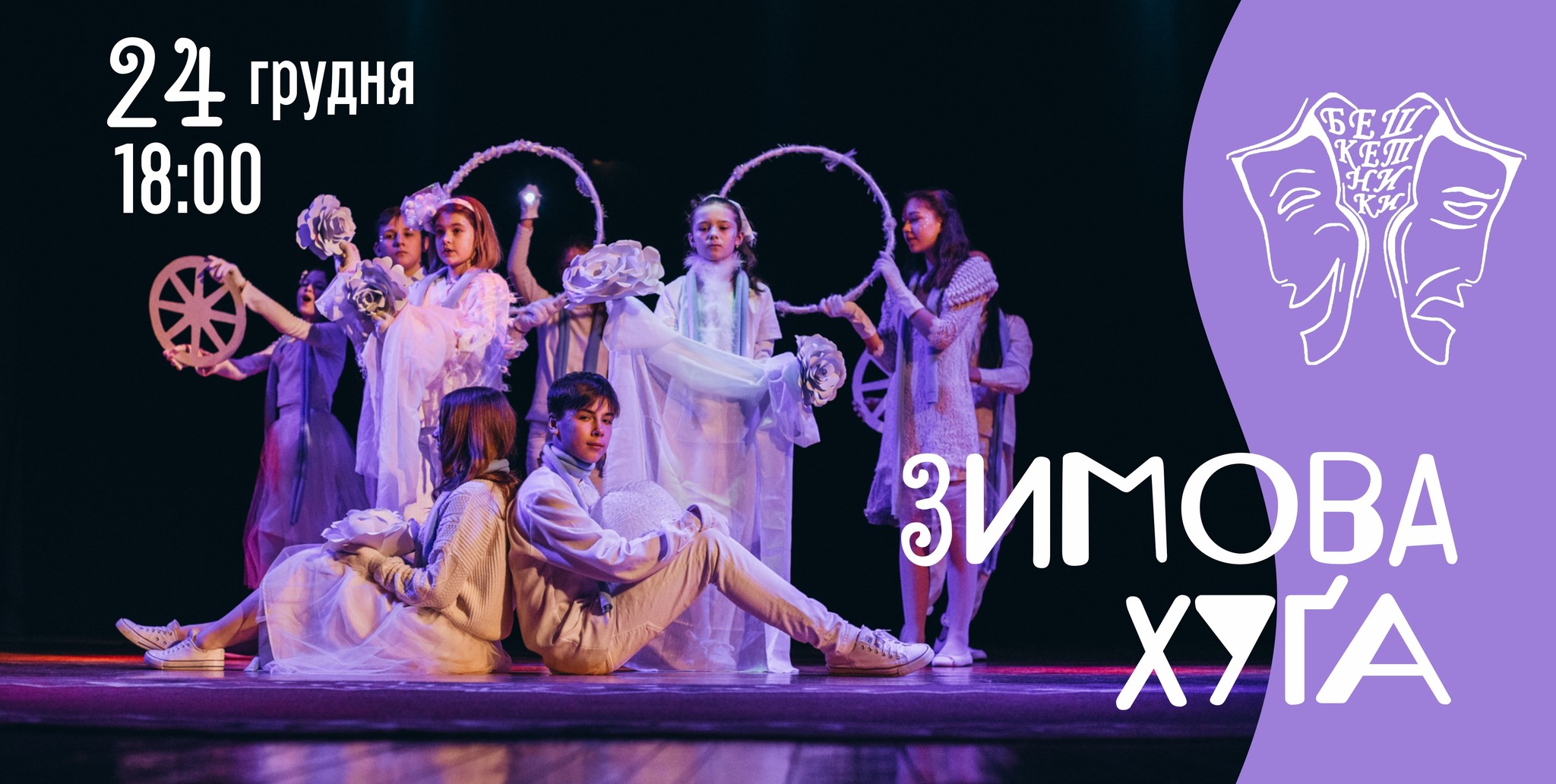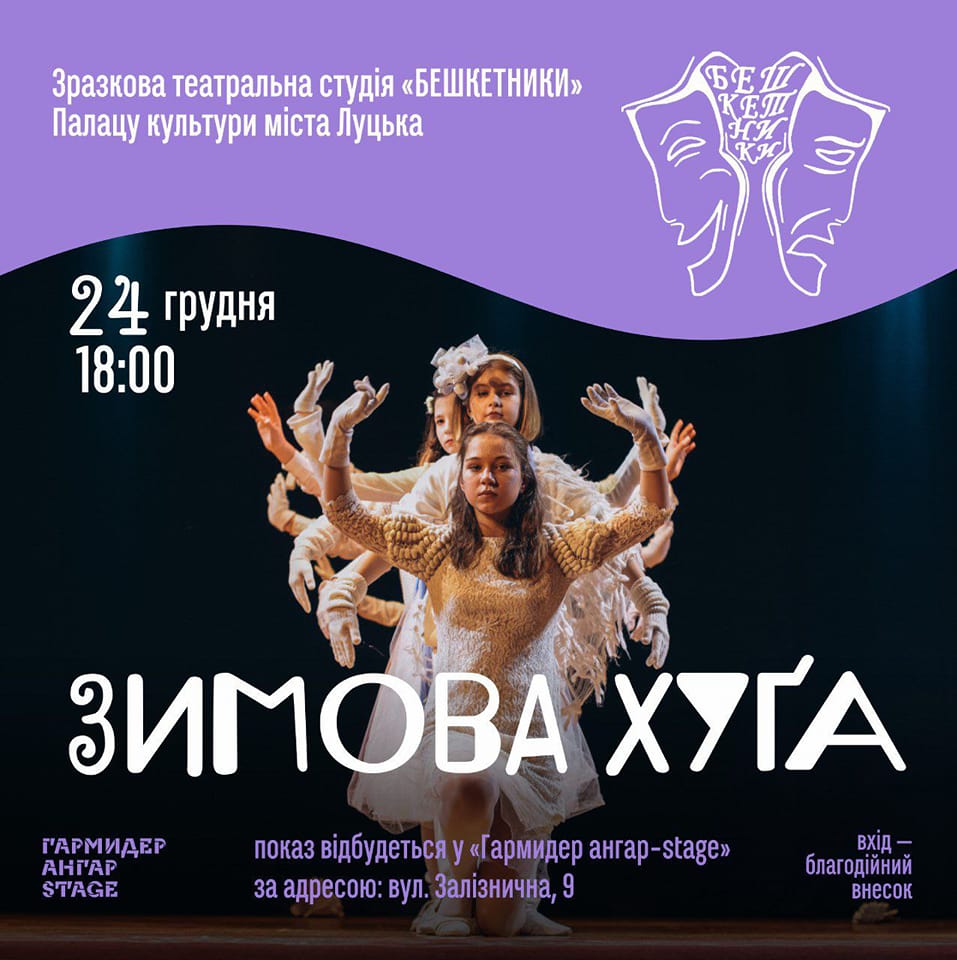 24 грудня о 18:00 ЗИМОВА ХУҐА — поетична вистава за віршами волинських письменників зразкової театральної студії Бешкетники Палацу культури міста Луцька.