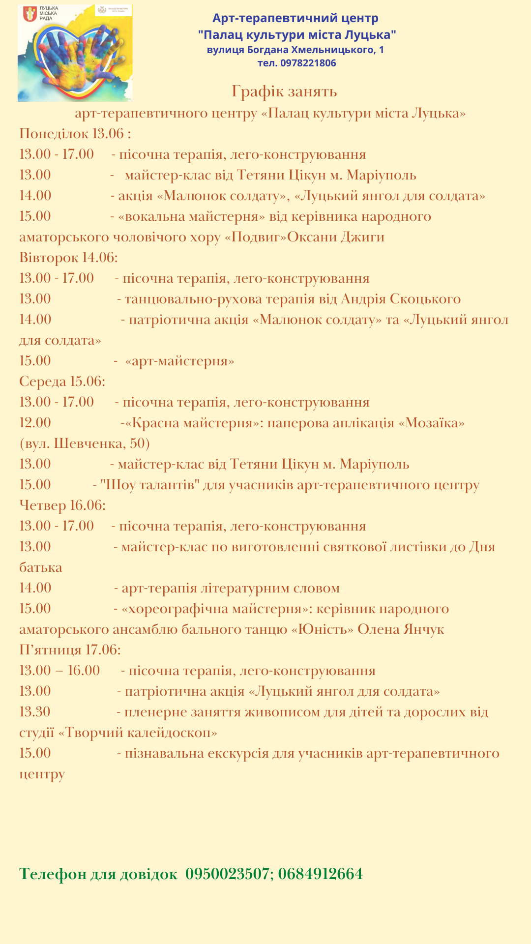 Графік занять арт-терапевтичного центру «Палац культури міста Луцька» (13.06 – 17.06):