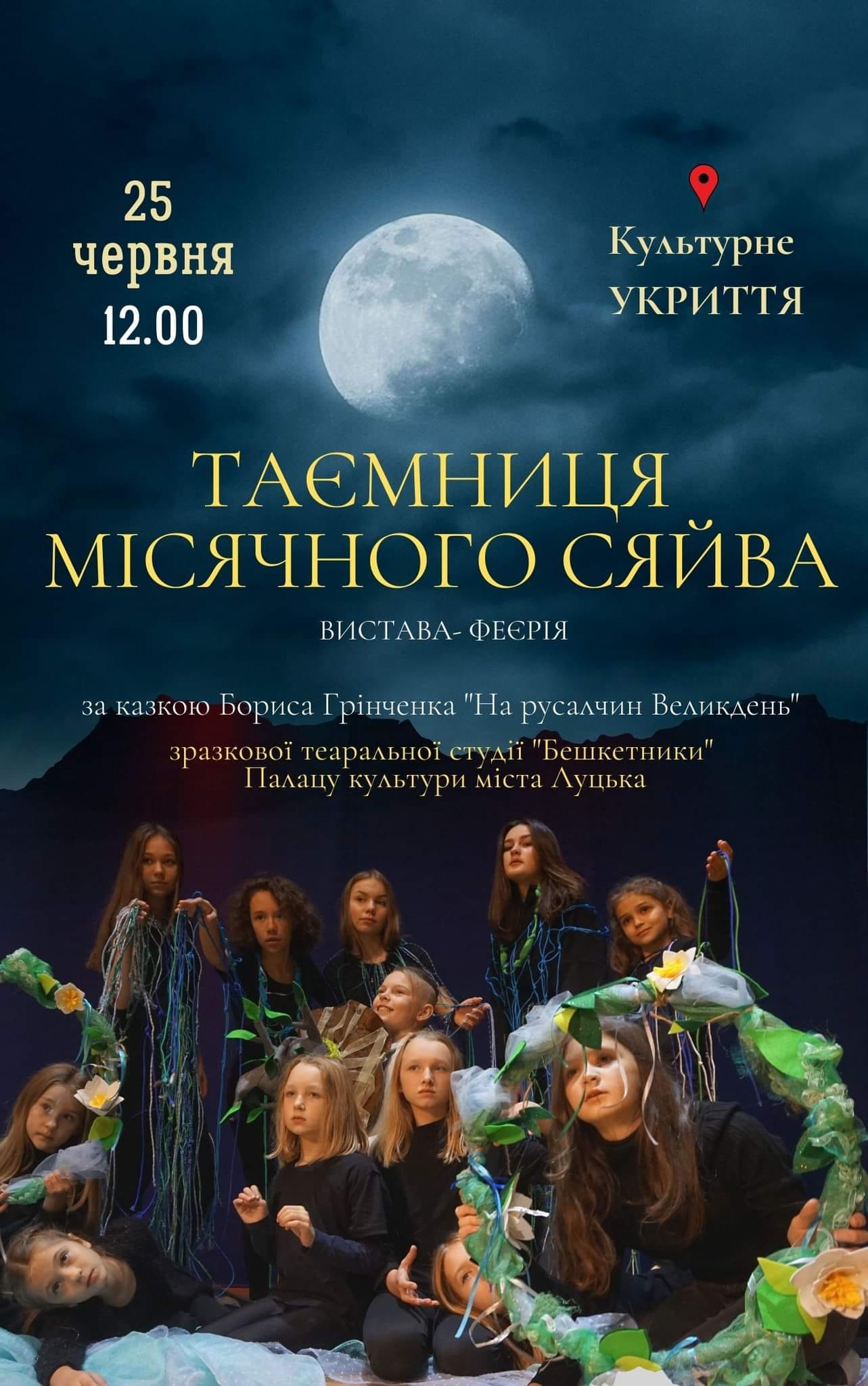Показ вистави-феєрії «Таємниця місячного сяйва» за казкою Бориса Грінченка відбудеться 25 червня о 12.00 в Культурному Укритті (вул. Яровиця, 13 (друге за порядком підвальне приміщення трохи далі за магазином Дніпро-М, якщо рухатися від РЦ «Промінь»)